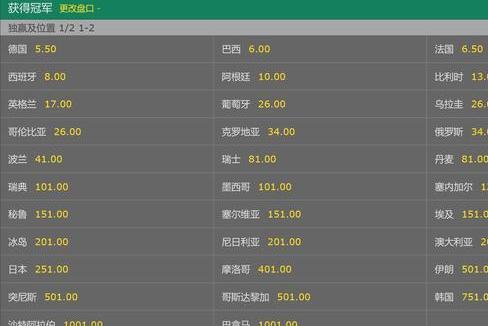 實際上,世界盃衛冕冠軍魔咒早在德國0-1小負墨西哥之後就有預兆。 在小組賽開賽前德國奪冠賠率為1賠5.50僅次於巴西,而在首輪爆冷輸給墨西哥後,德國奪冠賠率一度飆升至1賠9.00,而同期爆冷的巴西、阿根廷奪冠賠率卻並未有太大變動,此舉恐怕也顯示出博彩公司對德國的不信任。 競技場上被顛覆的,不僅僅是人們的觀念,還有昔日足球強國的霸權。 俄羅斯的星空,因為冷門的頻臨,在六月的艷陽下搖曳生輝。 隨著2026年世界盃臨近,無數球迷與投注者開始密切關註賠率變化與盤口解讀。